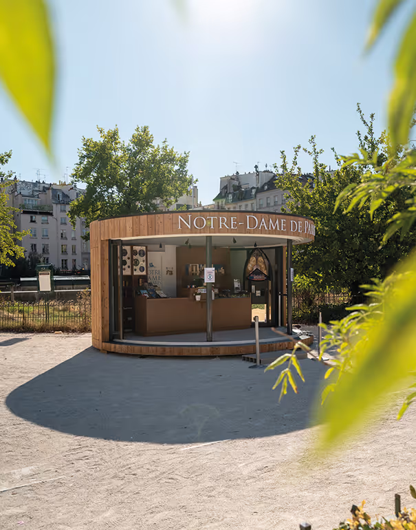Avec cette structure, la cathédrale Notre-Dame offre a ses visiteurs une vue a 180° sur le parvis. Le WoodPod était le choix idéal pour cet Accueil-Boutique, une structure accueillante, au format idéal, qui permet aux visiteurs de profiter d'un espace ouvert sur l'extérieur.