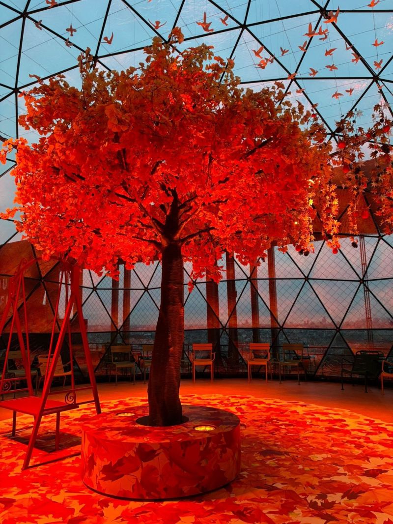 Entièrement transparent, le dôme a accueilli un arbre monumental aux teintes automnales, une scénographie évolutive et des animations interactives, transformant la terrasse en une parenthèse poétique, visible de jour comme de nuit.